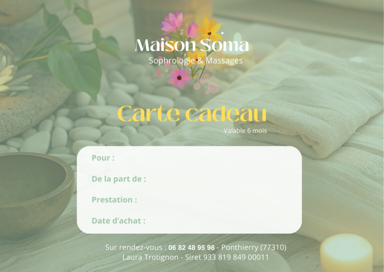 Contactez-moi par téléphone au 06.82.48.95.98 afin que nous puissions fixer ensemble un moment pour récupérer le bon papier du montant de votre choix directement à Maison Soma à Saint-Fargeau-Ponthierry.